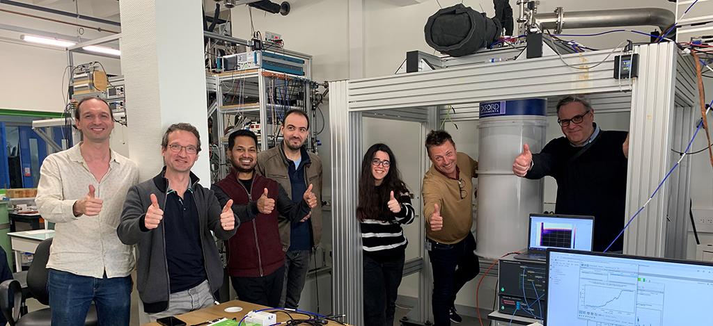 The photo shows the VIQTHOR and PHELIQS teams gathered around the Viqthor electronics and the cryostat
